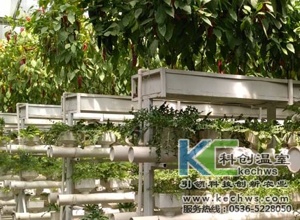 頂部使用基質(zhì)槽栽培果菜,下部使用管道水耕栽培種植葉菜,是常見的混合型無土栽培技術(shù)模式之一,主要應(yīng)用于觀光展示型無土栽培農(nóng)業(yè)。